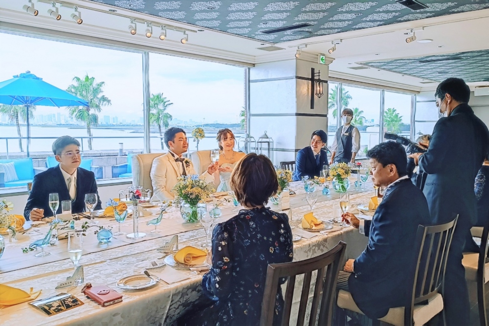 乾杯と同時にカーテンが開くと、そこには柔らかな日差しを受けてきらめく東京ベイの景色が広がります。