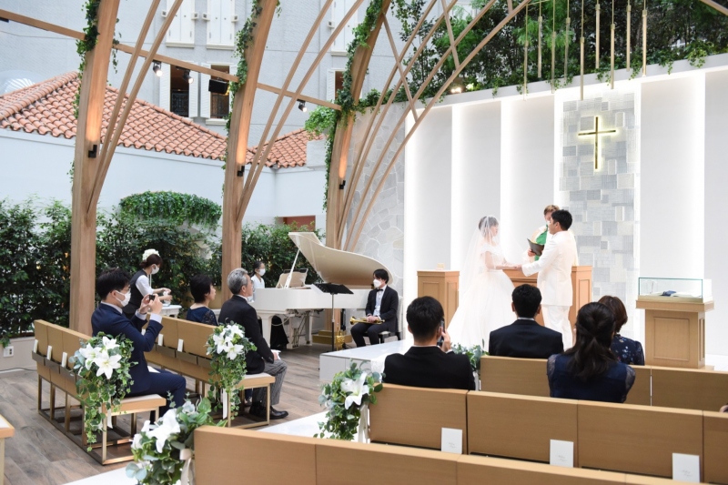 緑につつまれるチャペルでの挙式に続き、東京ベイのパノラマが魅力のシーサイドバンケットでお食事会。