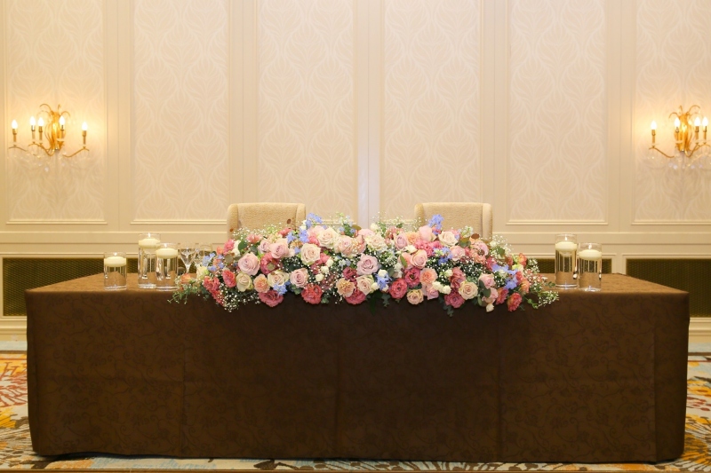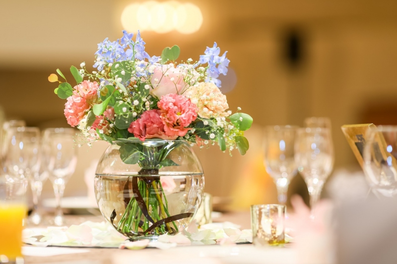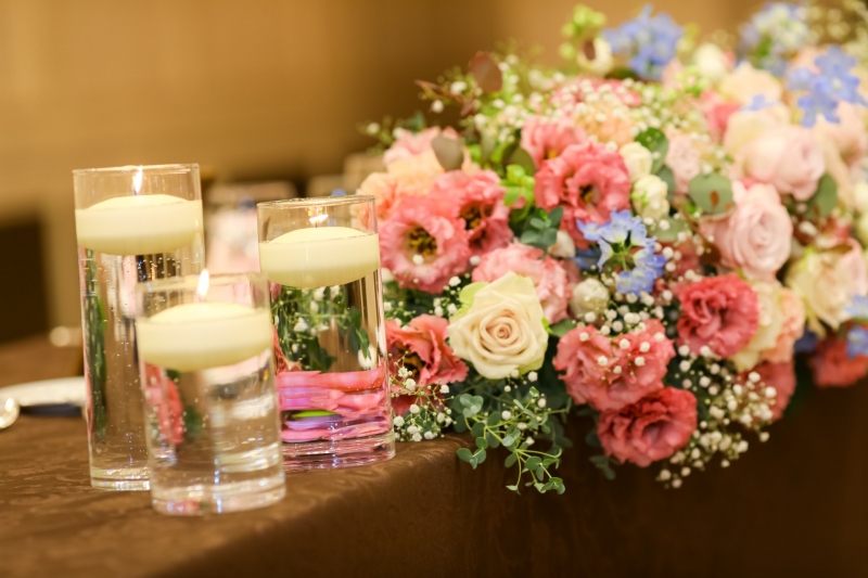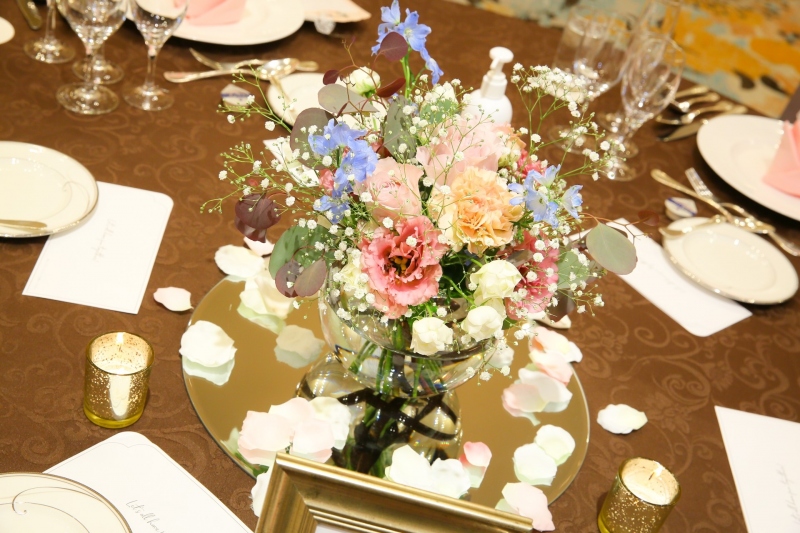 テーブル装花はゴージャスに咲く鮮やかなピンクのトルコキキョウを中心に、淡いピンクとホワイトのバラでやわらかく優しい雰囲気に。