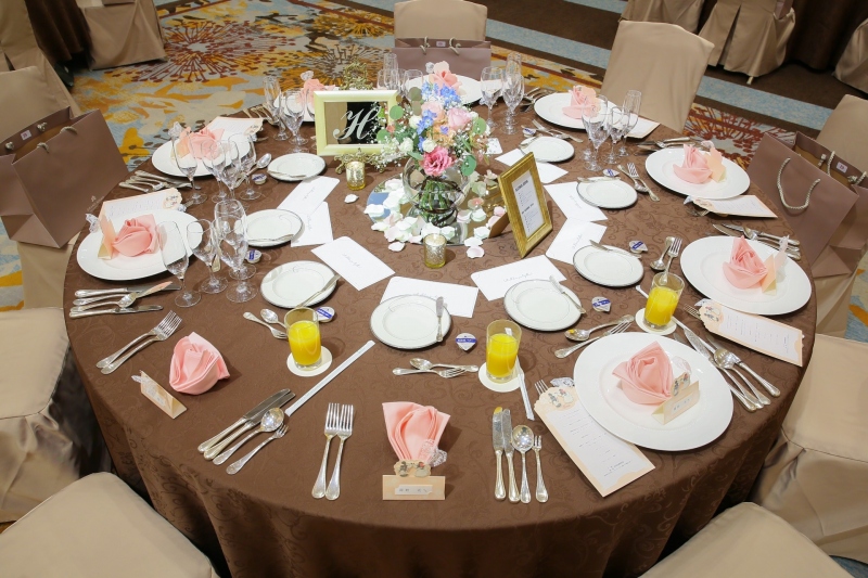 テーブルクロスにはピンクと相性の良い濃いめのブラウンをチョイスして全体を引き締めます。