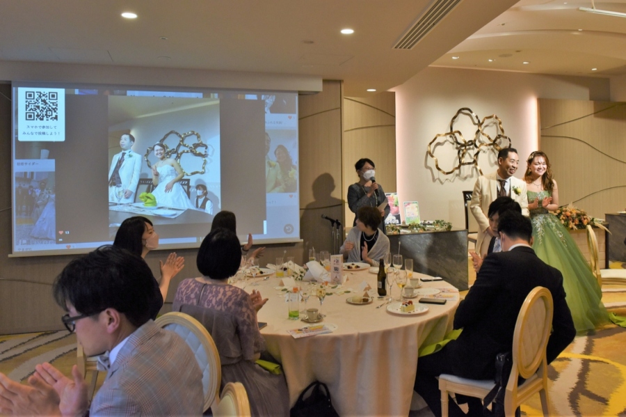 ゲスト参加型の「フォトシェア」では、新郎新婦やご列席の皆さまの自然な笑顔や面白い表情など、それぞれの目線で撮影いただいたお写真をリアルタイムで共有でき、おふたりのご中座中でも皆さまで盛り上がれる演出です。