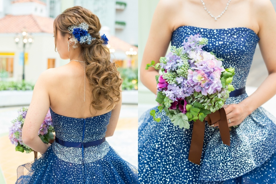 ネイビーカラーをベースに、細かなグリッターを散りばめた星空のような「KIYOKO HATA(キヨコハタ)」のカラードレスは、ご新婦 Yumiさんの運命の1着。