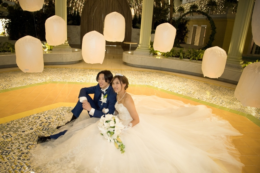 そんなムードたっぷりのアトリウムで行われたナイトフォトでは、ランタンのあたたかな光につつまれながら撮影をなさいました。
