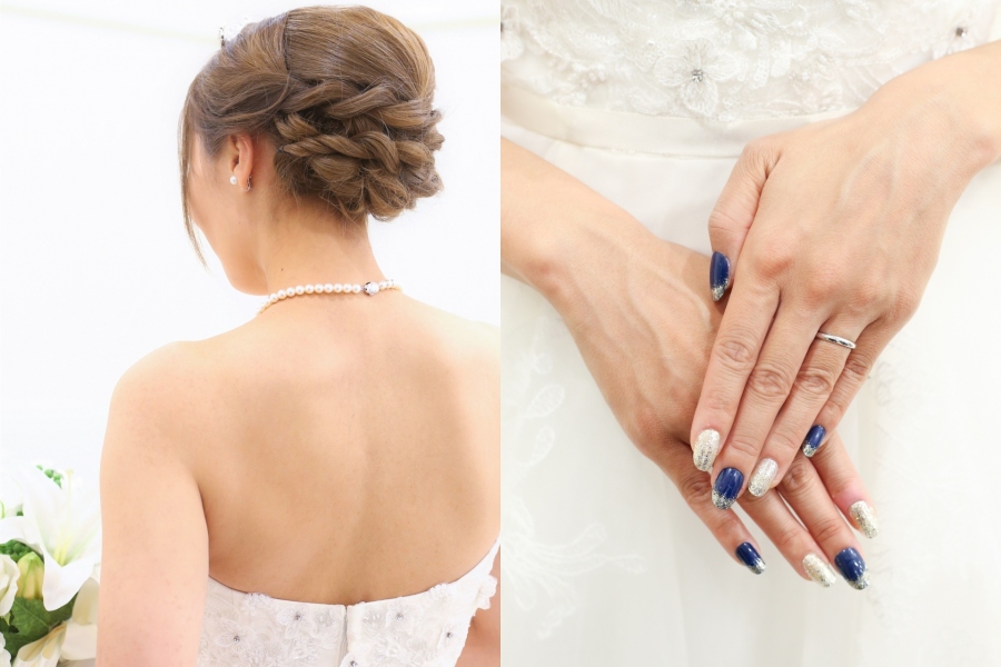 ネイルは最初にお召しになったカラードレスやご新郎のタキシードとリンクしたブルーを取り入れて。
