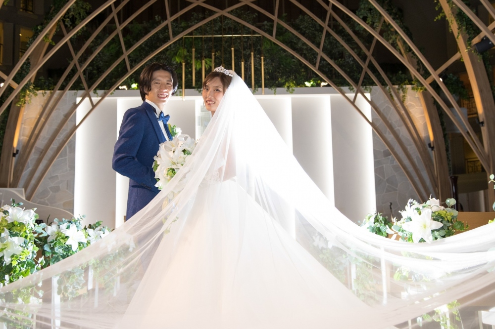 長いベールをなびかせると、チャペルのライトアップと相まってとても幻想的。