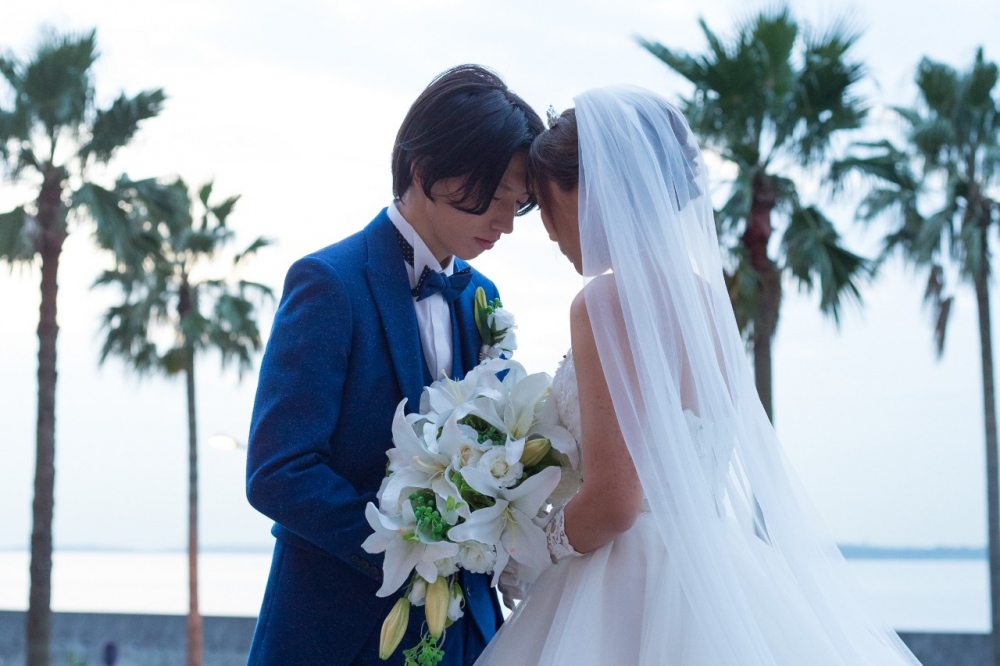 リゾートならではの景色を背景にしたシーンからは、爽やかなブルーのタキシードと純白のウエディングドレスにチェンジ。