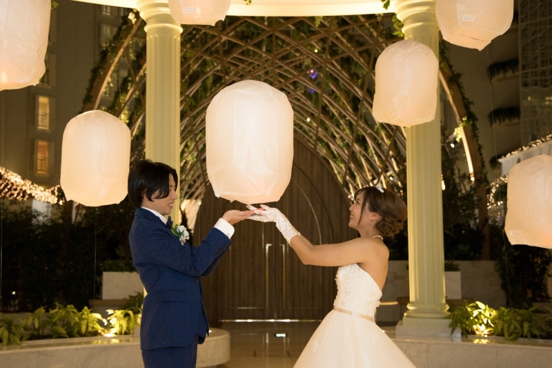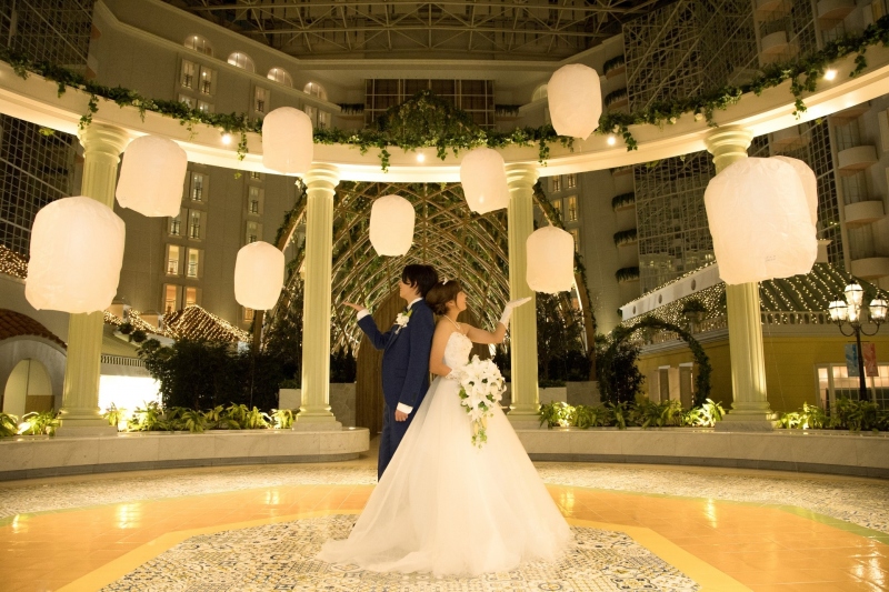 そんなムードたっぷりのアトリウムで行われたナイトフォトでは、ランタンのあたたかな光につつまれながら撮影をなさいました。