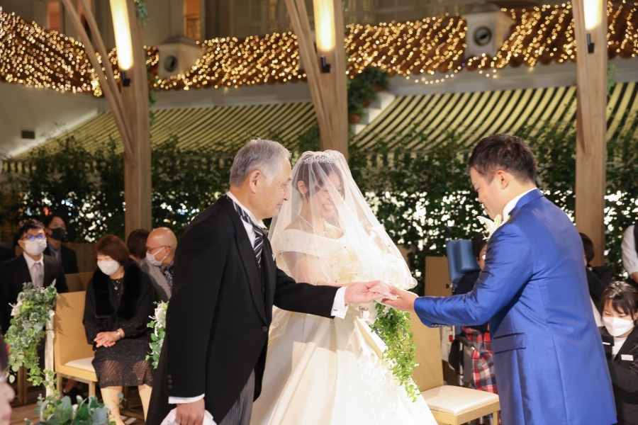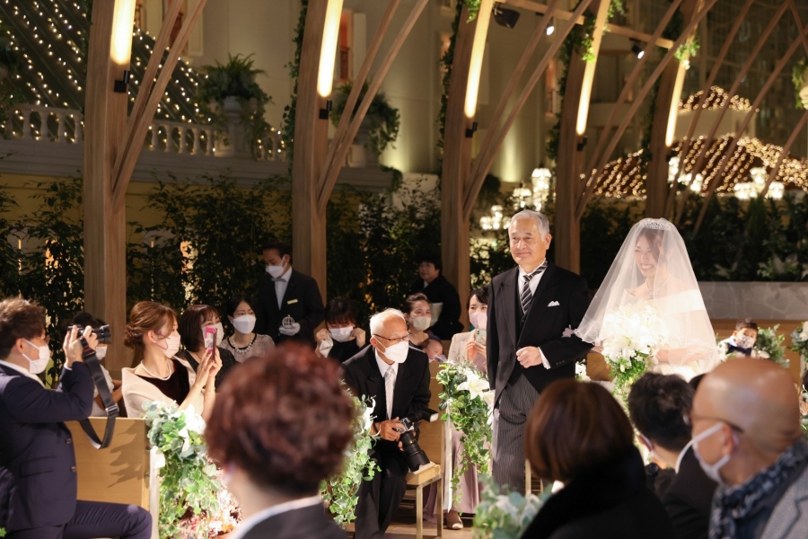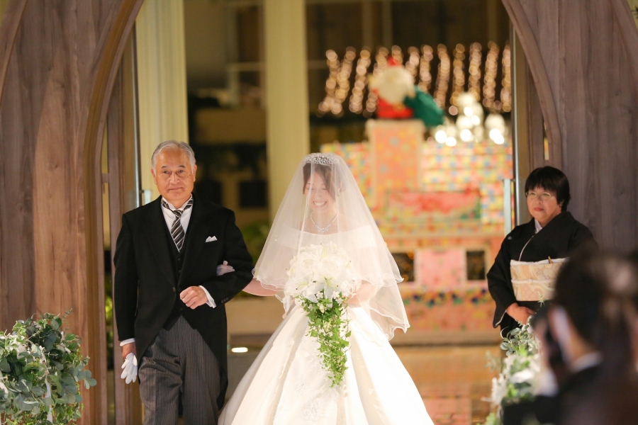 やや緊張気味のお父さまはお嬢様のご誕生から今までの思い出をかみしめながら、そしてご新婦はご両親に感謝の気持ちを伝えながら、ゆっくりと歩を進めます。