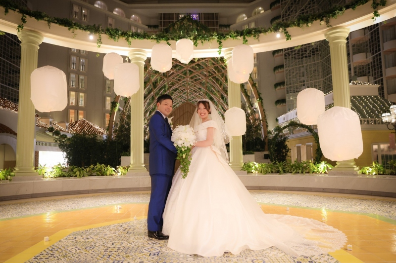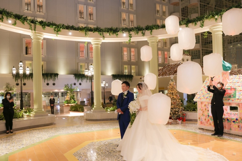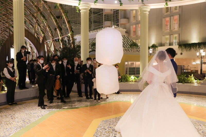 式場前の広場には、あたたかな光に満ちたランタンがふわふわと浮かび、まるでおとぎ話のワンシーンのよう。