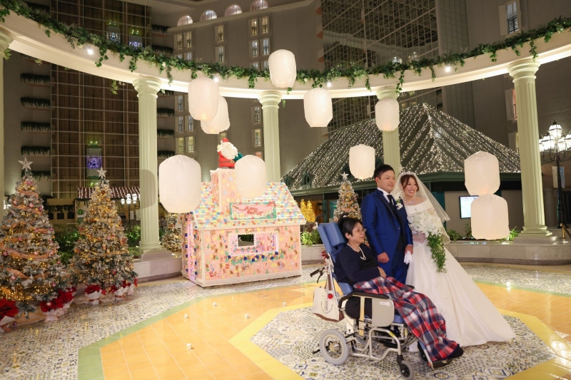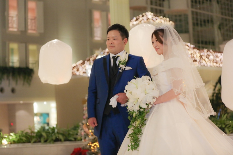 クリスマスシーズンの12月を迎え、さらにライトアップされ幻想的な雰囲気のアトリウムに佇む式場。