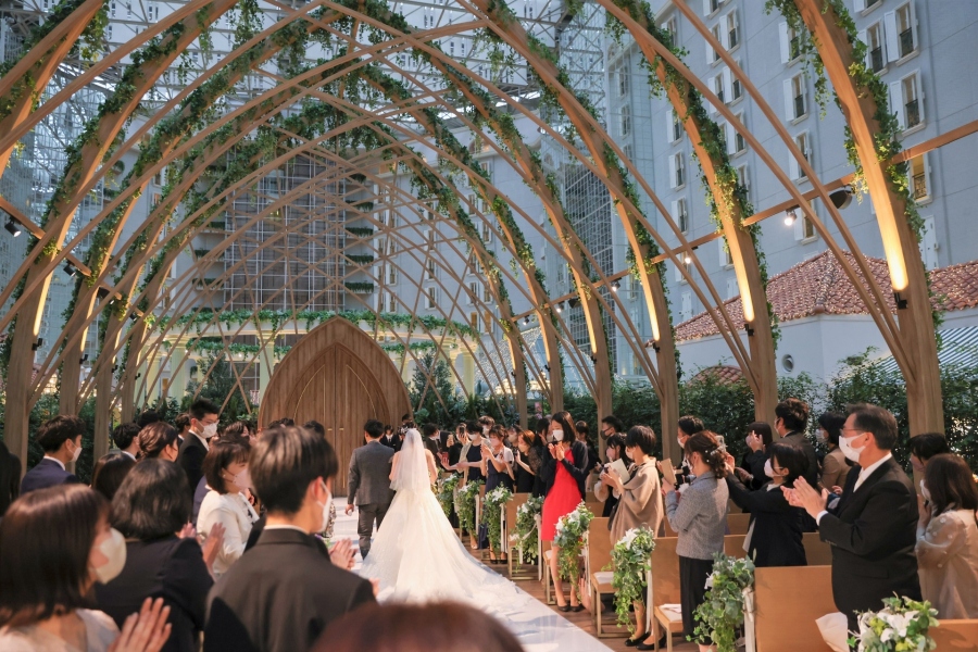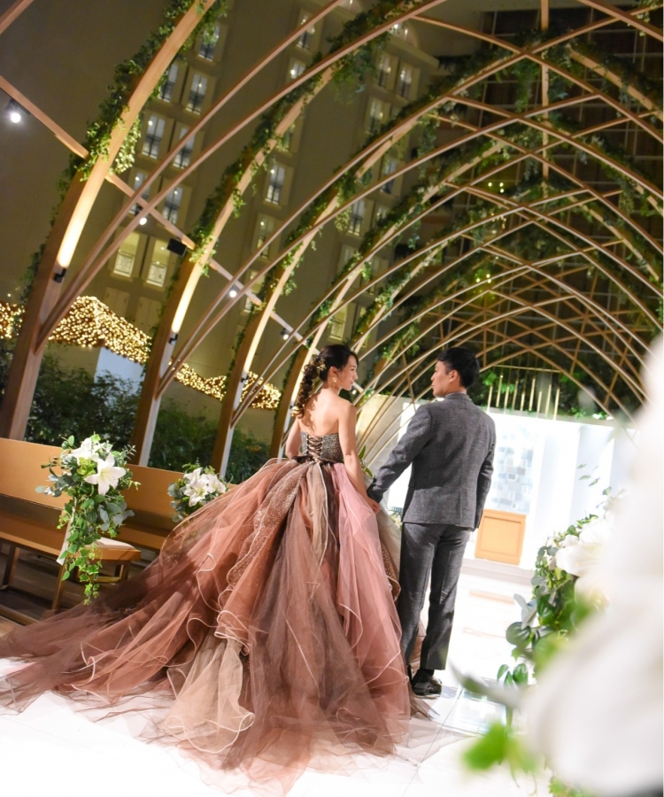 おふたりの挙式は、屋内にいながら自然光を感じられるアトリウムチャペルで、夕方から執り行われました。