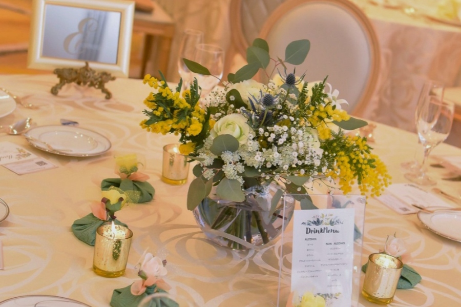 - 会場装花もミモザを主役に、ユーカリのグリーンとホワイトの花々がナチュラルな印象。