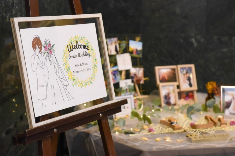 - ご新婦がお好きな花 “ミモザ” が描かれたウエルカムボードと思い出の写真を飾ってお出迎え。