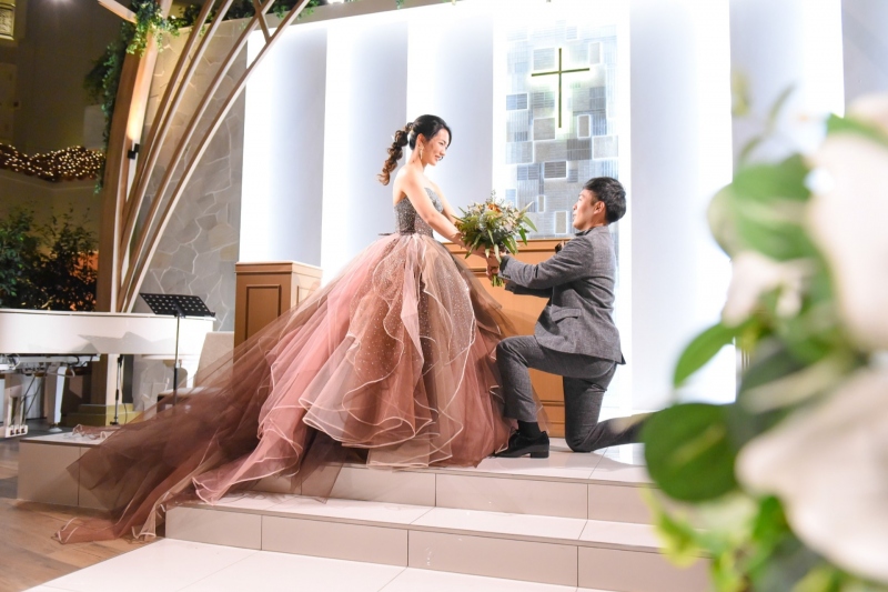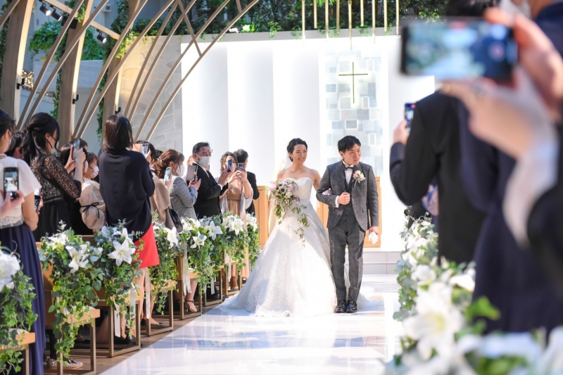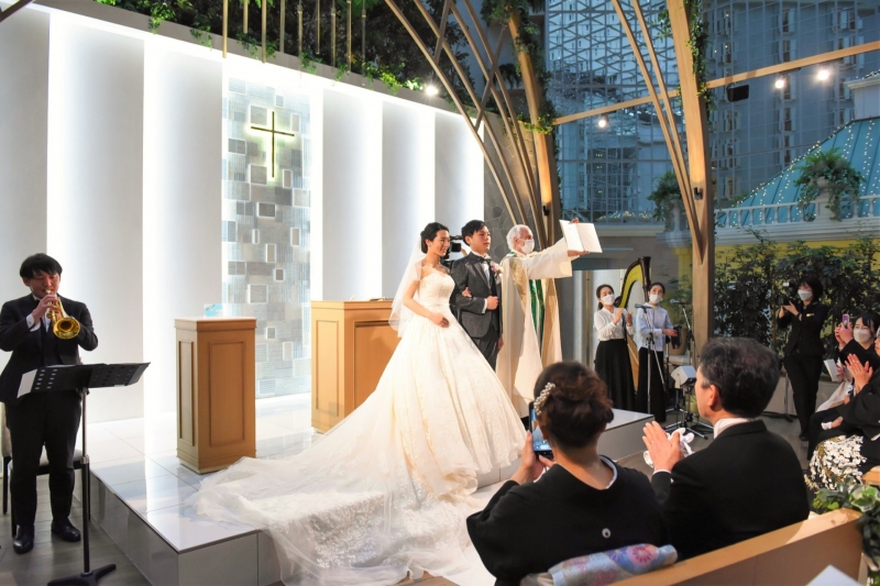 おふたりの挙式は、屋内にいながら自然光を感じられるアトリウムチャペルで、夕方から執り行われました。