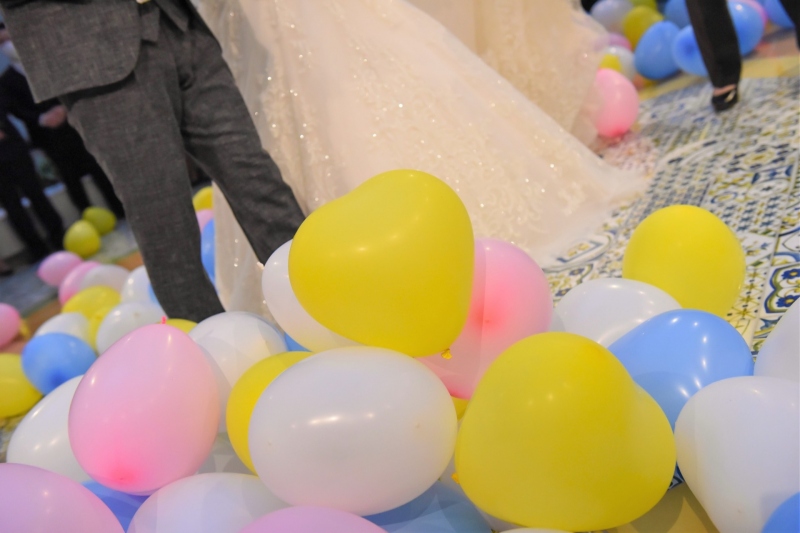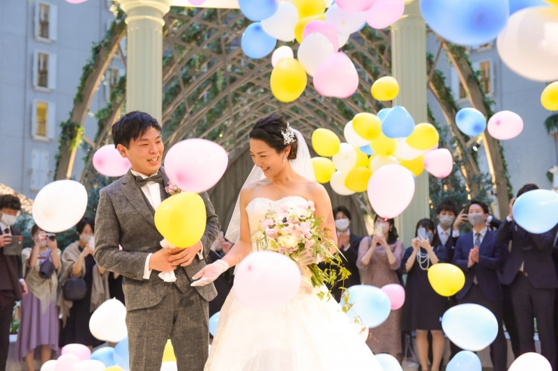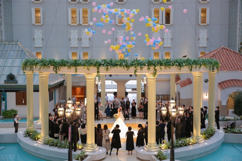 アフターセレモニーではチャペル前のGazebo(ガゼボ)で、新郎新婦を囲むようにゲストにお集まりいただいてバルーンシャワーを。