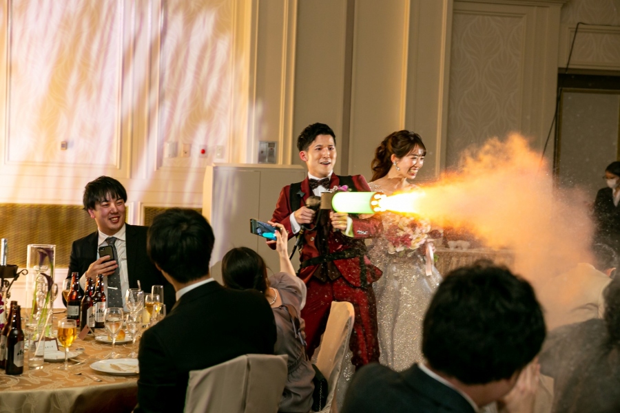 BGMとともに扉が開くと、CO2のジェットガンを放ちながら新郎新婦がご入場!扉の両サイドからは花火が吹き上がり、その迫力に皆さまのテンションも一気に盛り上がります。