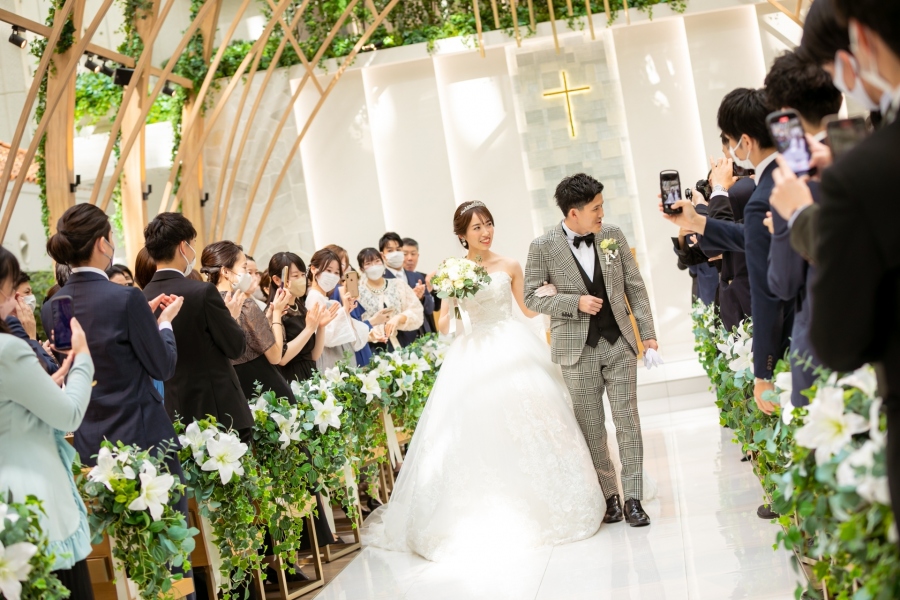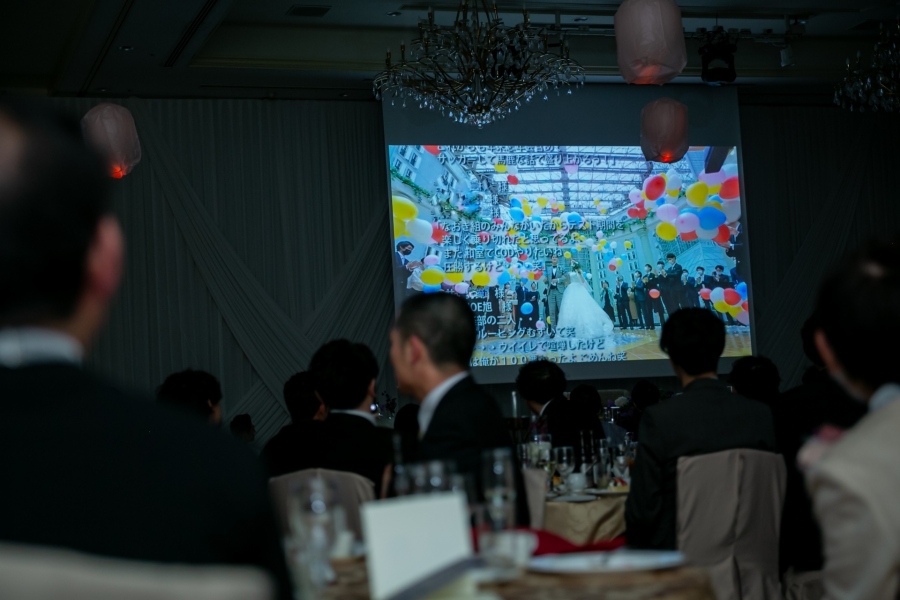 謝辞のあと、新郎新婦が一足先に退場し、ゲストの皆さまは挙式のダイジェストエンドロールをご鑑賞。