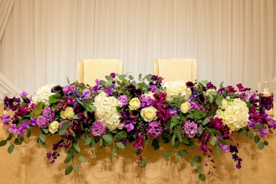 - メインテーブルは濃淡さまざまなパープルの花や、ボリュームのある白いアジサイで鮮やかに彩って。