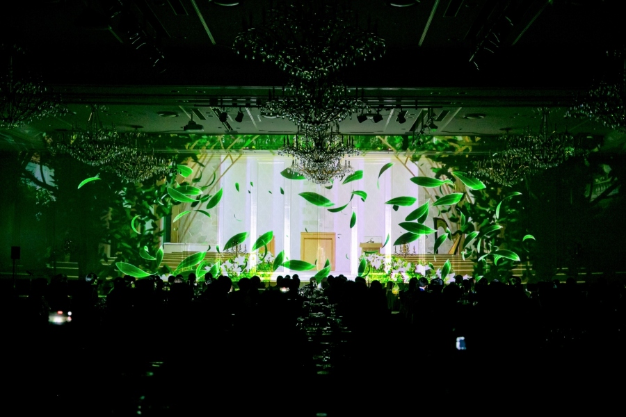会場が暗転すると、壁いっぱいに映し出されたプロジェクションマッピングがゲストの皆さまを一気に非日常の世界観へ誘います。