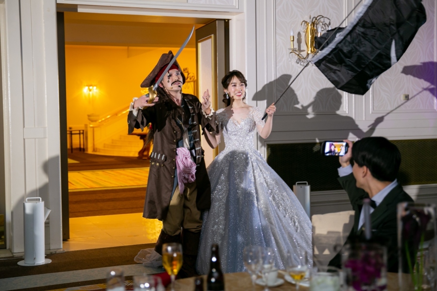 そう!あの海賊…に扮したご新郎です!ご退場後、エンドロールの上映中にタキシードから早替えなさいました。花嫁が手にするのはジョリー・ロジャー(海賊旗)。フィナーレを飾るにふさわしい、新郎新婦の満を持しての演出です。