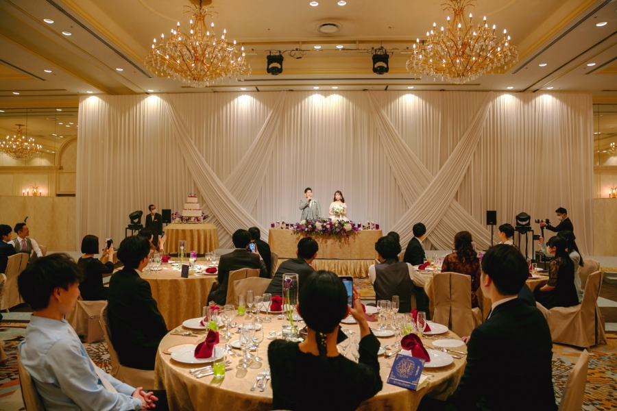 ホテルウエディングならではのシャンデリア煌めく豪華な会場と、洗練されたコーディネートでゲストをお迎えし、いよいよ披露宴が幕を開けます。