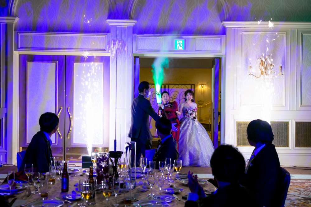 BGMとともに扉が開くと、CO2のジェットガンを放ちながら新郎新婦がご入場!扉の両サイドからは花火が吹き上がり、その迫力に皆さまのテンションも一気に盛り上がります。