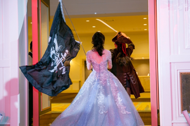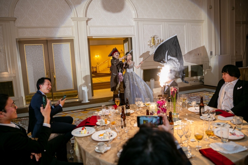 そう!あの海賊…に扮したご新郎です!ご退場後、エンドロールの上映中にタキシードから早替えなさいました。花嫁が手にするのはジョリー・ロジャー(海賊旗)。フィナーレを飾るにふさわしい、新郎新婦の満を持しての演出です。