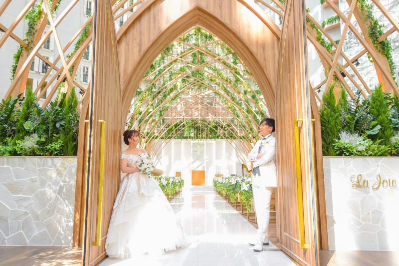 互いに手を取り見つめ合うお姿が、おとぎ話のハッピーエンドを思わせる素敵なショットです。