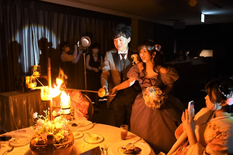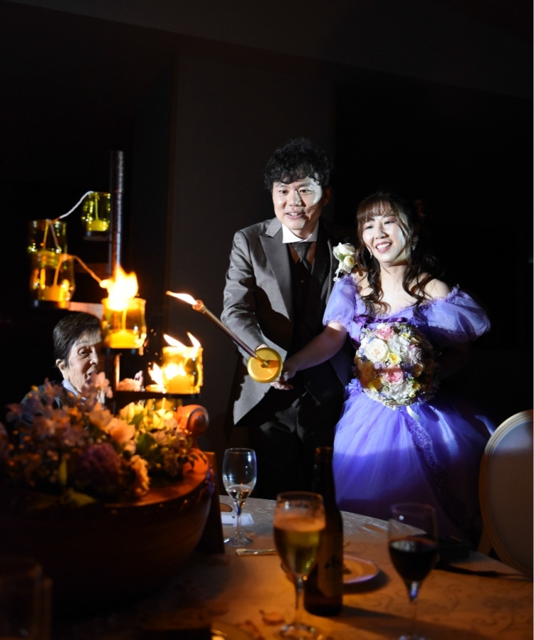 新郎新婦とゲストの皆さまで願いを込め心を一つに、一番下のキャンドルに点火するとトップまで炎が昇っていく様子にゲストから驚きと歓声が上がります。