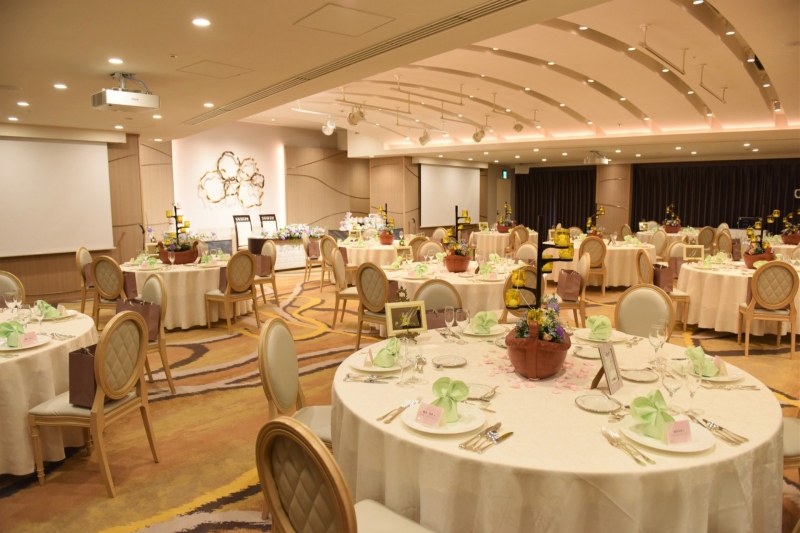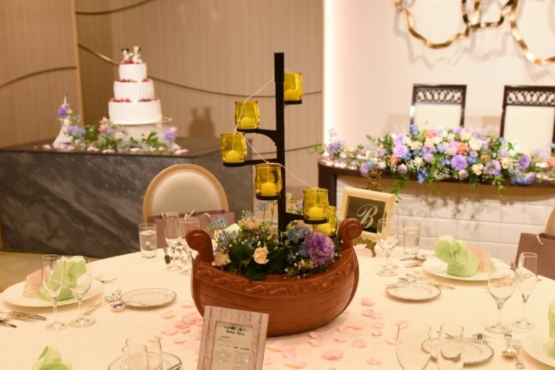 ゲストテーブル中央の船のモチーフは再入場時の演出に華を添えます。