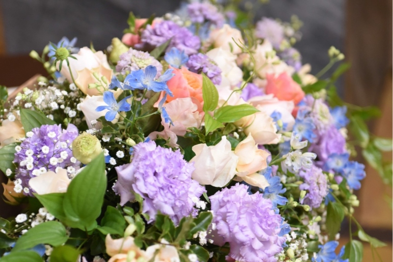 このあとパーティーでお召しになるカラードレスにも似合うブーケをとのご希望から、フローリストが心を込めてお作りしました。