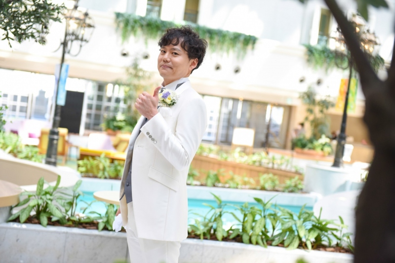 ご新郎は華やかな光沢感のある細身シルエットのロングタキシードを爽やかに着こなして、様々なポーズをとってくださりながら、ご新婦をやさしくエスコート。