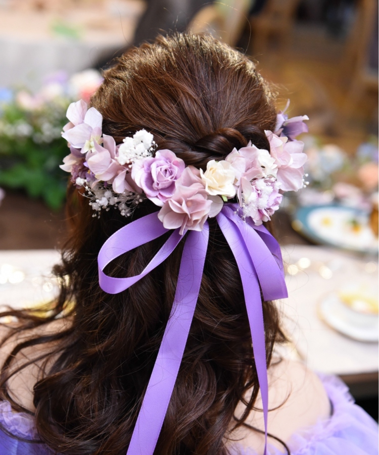 パープルのお花がたっぷりのヘッドパーツとリボンを組み合わせたスタイルがドレスをより引き立て、とても華やかで可憐な印象に。