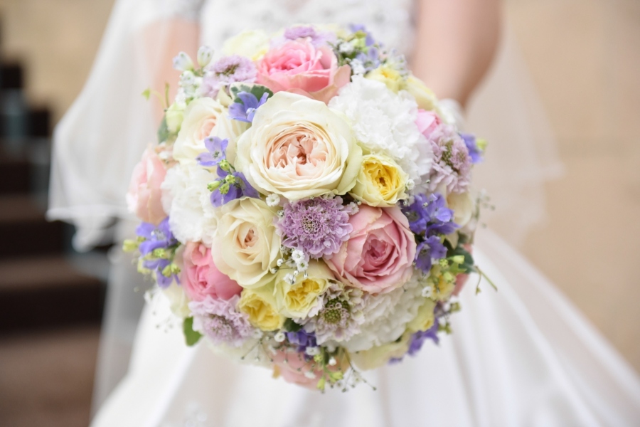 淡い色合いがご新婦のやわらかな雰囲気にぴったりのラウンドブーケ。