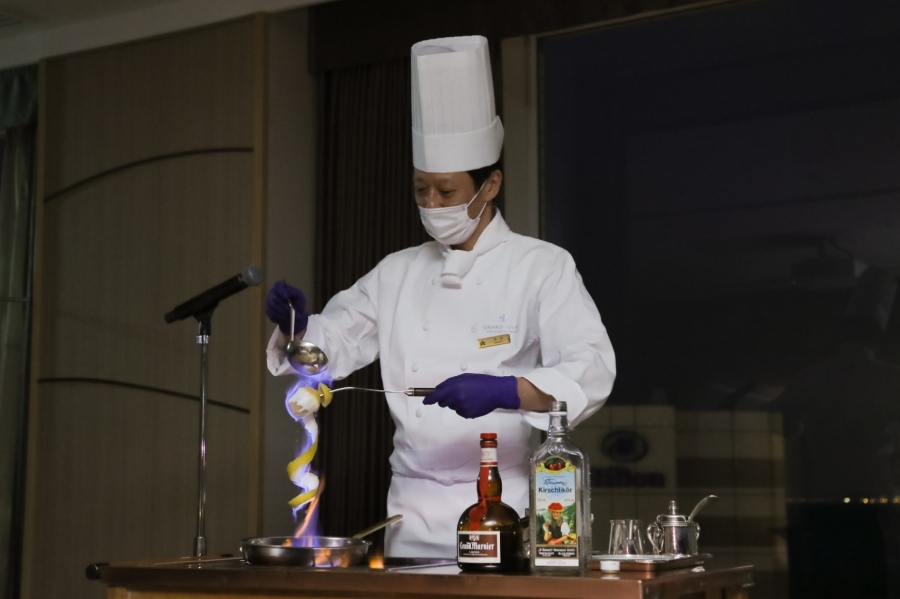 ゲストの皆さまには、ダークチェリーのソースを作る際のパフォーマンスをお楽しみいただきます。