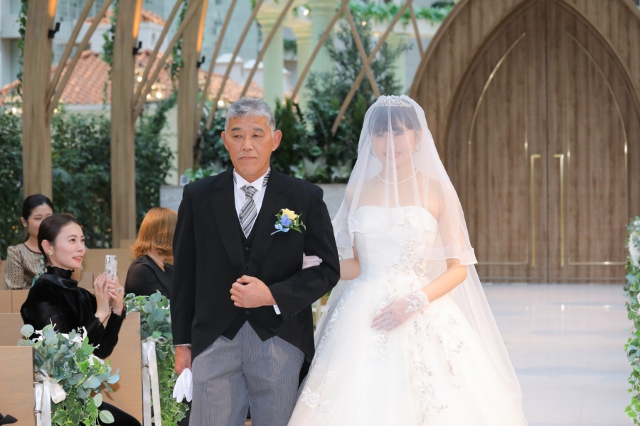 - これまでの思い出を振り返りながら、お父様とバージンロードをゆっくり歩みます。