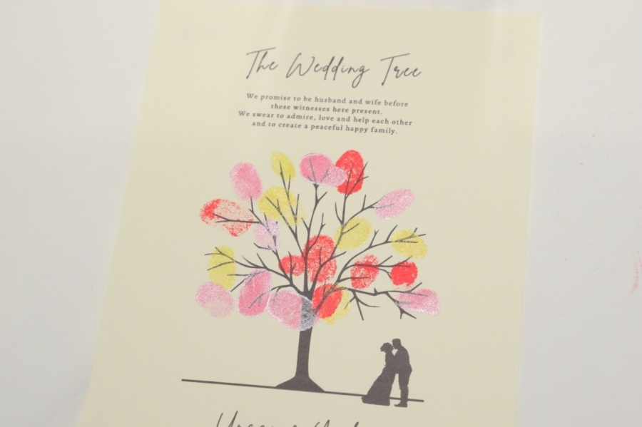枝だけが描かれた木の絵に、ゲストおひとりおひとりのフィンガースタンプ(指印)が木の葉のように見える世界に一つだけのツリー。