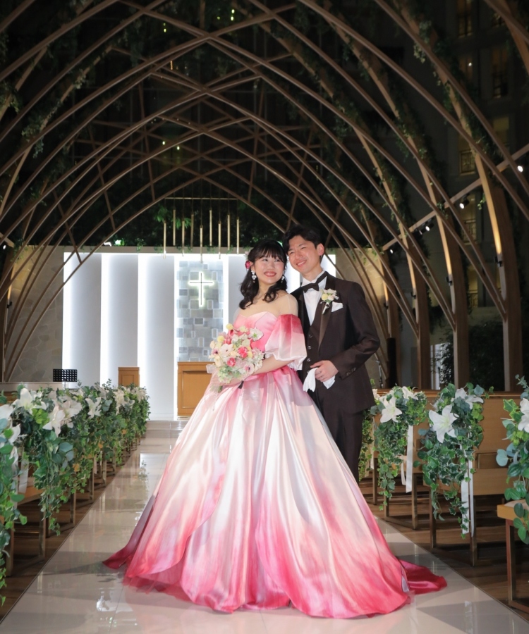 ご新郎はピンクのドレスと相性抜群のダークブラウンのタキシードをお召しになり、おふたりのバランスも◎