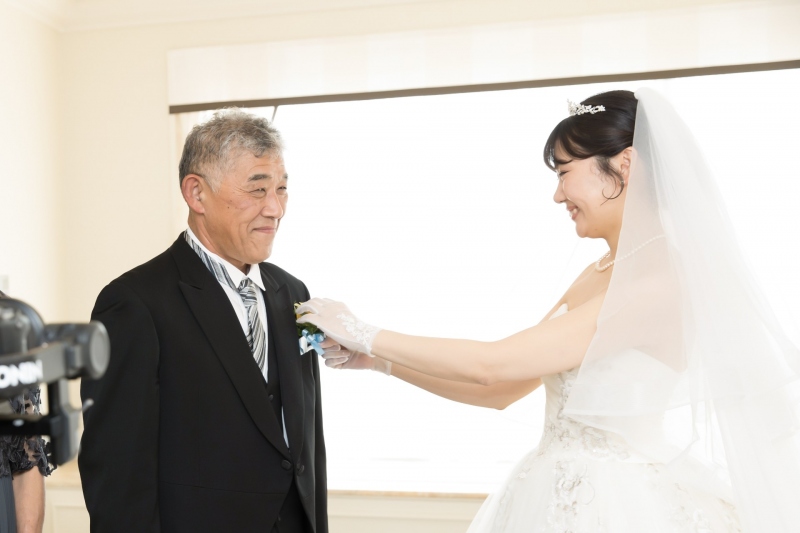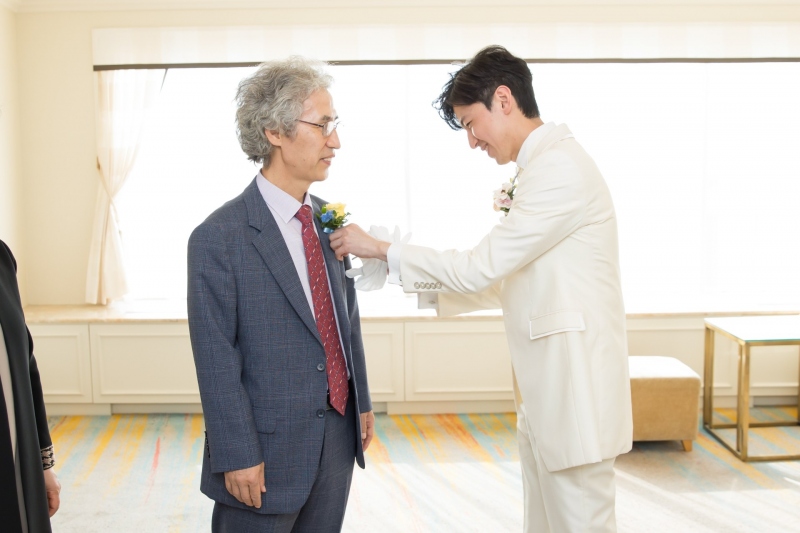 新郎新婦とご家族だけでゆったりと過ごせるひとときに、ご両家のお父様方へ、育てていただいた感謝の気持ちを込めたブートニアを胸元に飾って差し上げます。