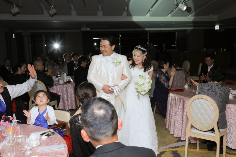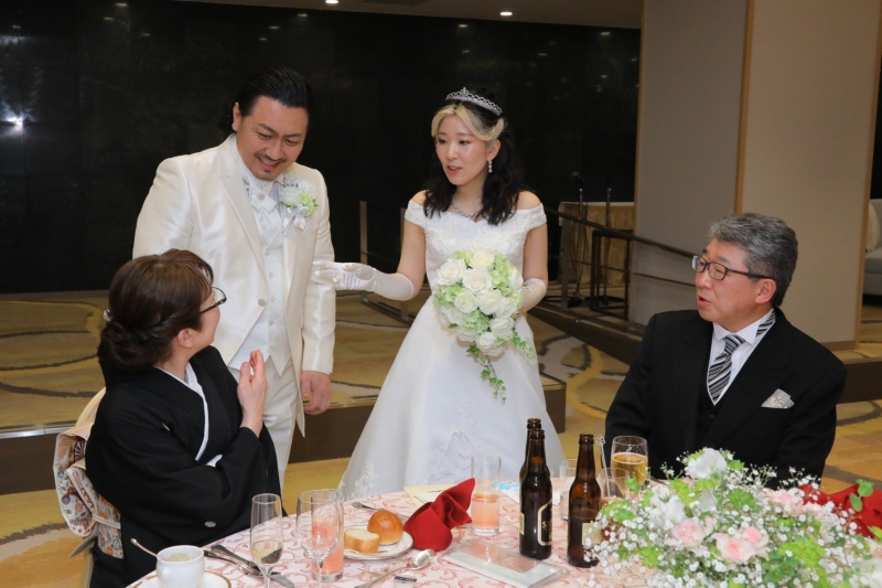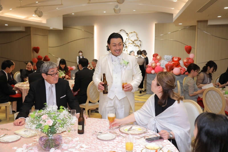 パーティー中は、新郎新婦ともに終始ゲストテーブルをラウンドされ、お酌をしたり近くでお話ししたりと、時間の許す限りご自身たちでおもてなしなさいました。
