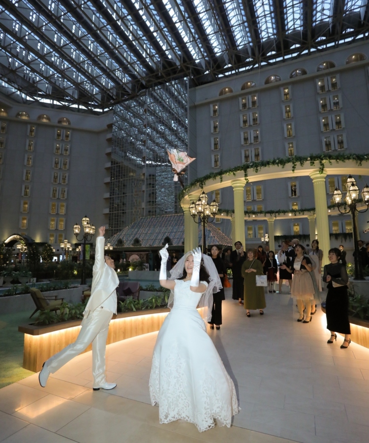 ご新婦のトスブーケでは、ご新郎も全力で応援なさいます。