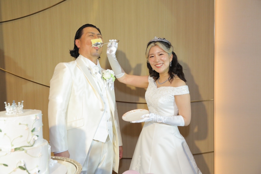 ケーキ入刀後のファーストバイトでは、ゲストの皆さまへのサービスとして、“お約束”の大きな一口をご新郎へ。