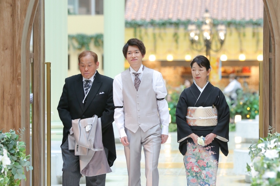ご新郎はご両親と一緒にご入場なさり、ジャケットセレモニーを。
