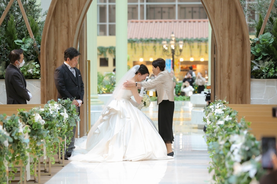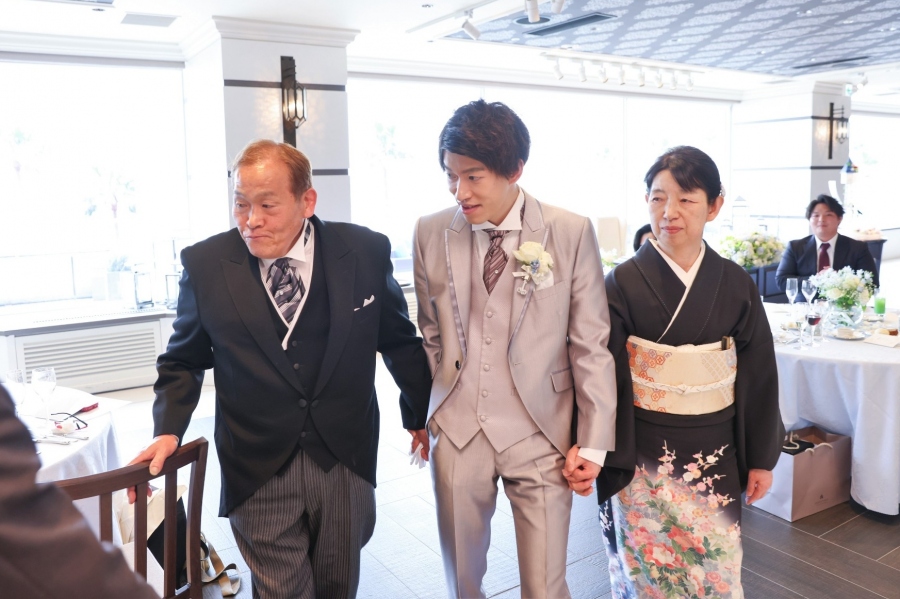 - ご新郎はご両親と手を繋いで。 幼い頃に自分を導いてくれた手を思い出しながら、今日新たに親子の思い出を作ることができました。