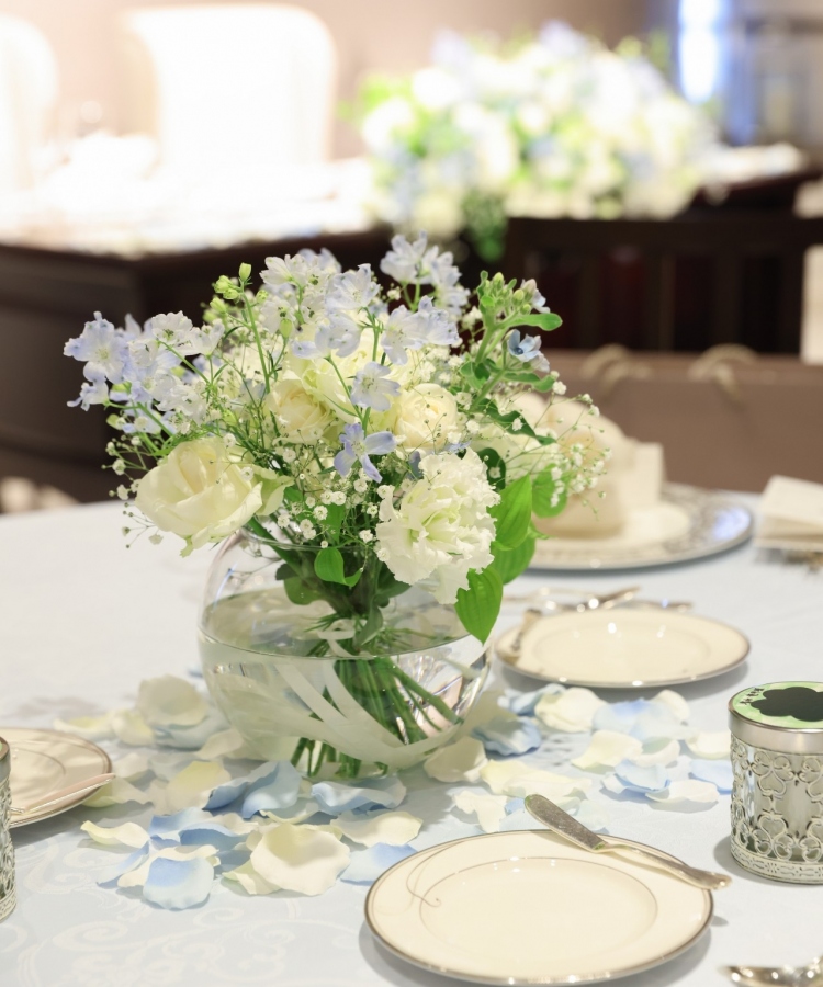 - 花嫁さまのブーケとリンクした、白とブルーのお花が清楚で可憐なアレンジメント。