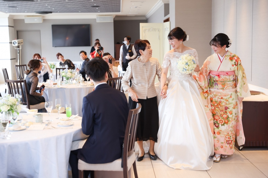 - ご新婦はお祖母様と妹様の3人で。 しっかりと手を繋ぎ、笑顔で言葉を交わします。