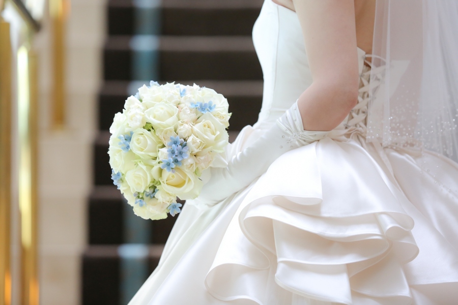 ブーケは真っ白なバラにお好きな青色をブルースターの花で取り入れた上品で愛らしいラウンド型。