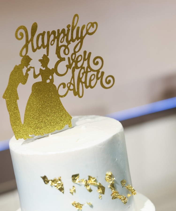 - おとぎ話の結びの台詞「Happily Ever After(いつまでも幸せに暮らしました)」がロマンティックなケーキトップ。