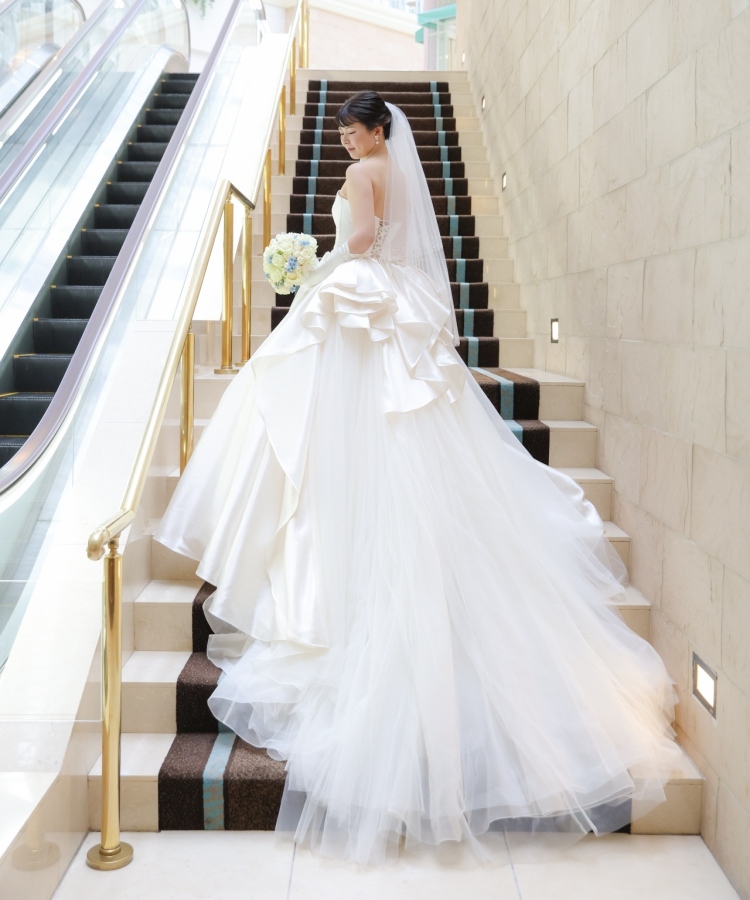 上質でなめらかなサテンをたっぷり使用したフリルがゴージャスで、バックスタイルにはチュールのトレーンが軽やかに揺れます。