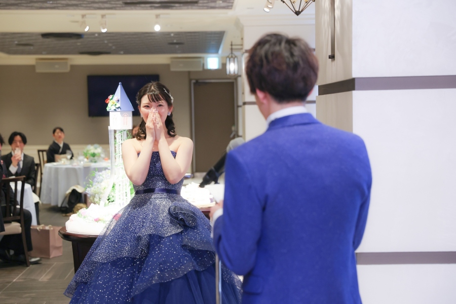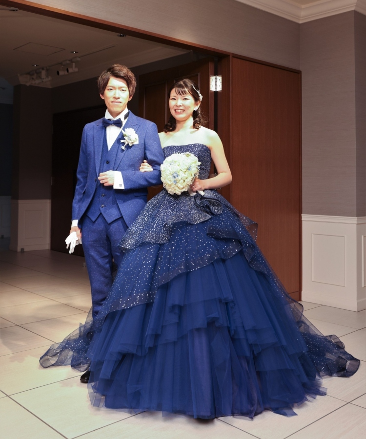 お色直しのご衣裳はおふたり揃って上品な雰囲気が漂うネイビーで統一なさいました。